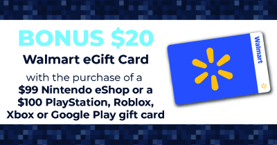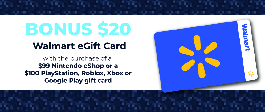 *Availability on Walmart.ca may differ from in-store. Offer valid at participating Walmart Canada locations and on Walmart.ca January 8 - 14, 2026 or while supplies last. To qualify for this promotion, customers must purchase a $99 Nintendo eShop or a $100 PlayStation, Roblox, Xbox or Google Play gift card. Receive one (1) $20 Bonus Walmart eGift Card. To claim your Bonus $20 Walmart eGift Card(s), go to getmybonus.ca. Claim must be made by January 16, 2026. Bonus eGift cards are available while supplies last. See website and/or gift card(s) for additional details, terms, and conditions. Further details, terms, and conditions may be available on the website and/or on the specific gift card(s) purchased. © Nintendo. PlayStation and "PS" Family logo are registered trademarks of Sony Interactive Entertainment LLC. © 2026 Roblox Corp. ROBLOX is a registered mark. Card issued by and ©/™/® Microsoft Corp., a Washington Corporation, and/or its affiliates. Card issued by and ©/™/® Microsoft Corp., a Washington Corporation, and/or its affiliates. Google Play is a trademark of Google LLC.