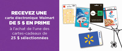 *La disponibilité sur Walmart.ca peut différer de celle en magasin. Offre valide dans les établissements Walmart participants du 16 au 29 octobre 2025, ou jusqu'à épuisement des stocks. Pour être admissible à cette promotion, les clients doivent acheter une (1) carte-cadeau Dairy Queen, Dominos Pizza, McDonalds ou Uber d’une valeur de 25 $. Avec chaque carte-cadeau achetée, le client peut recevoir une (1) carte-cadeau électronique Walmart de 5 $. Pour réclamer la ou les carte(s)-cadeau(x) électronique(s) en prime allez à obtenirmaprime.ca au plus tard le 31 octobre 2025. Disponible jusqu'à épuisement des stocks de cartes-cadeaux électroniques seulement. Voir le site web et/ou les cartes-cadeaux pour plus de détails et les conditions. Toutes les marques déposées sont la propriété de leurs propriétaires respectifs.